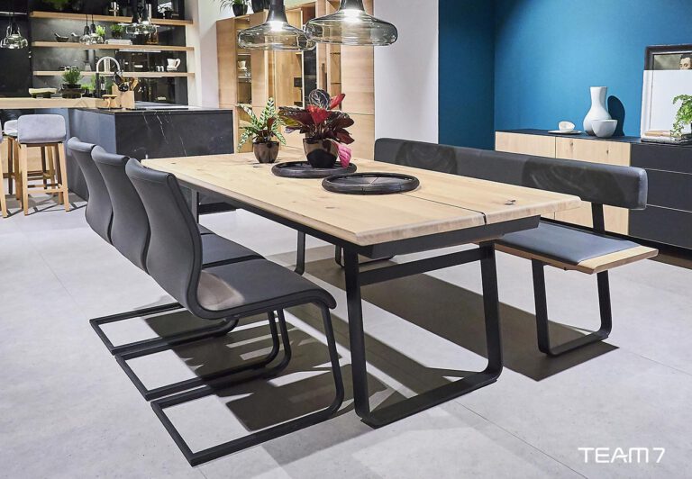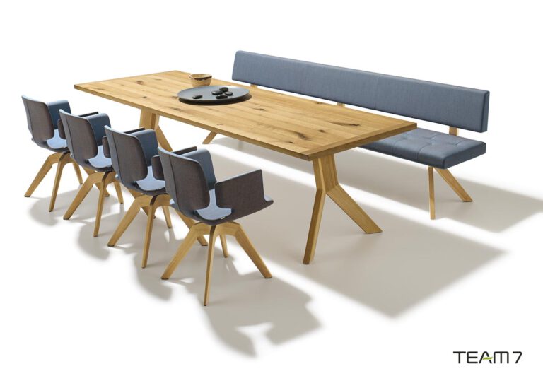 Ein Tisch von TEAM 7 vereint modernes Design mit traditioneller Handwerkskunst. Das hochwertige Laubholz aus nachhaltiger Forstwirtschaft schafft eine warme, einladende Atmosphäre und garantiert Langlebigkeit.